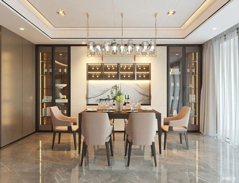 餐廳的裝飾平時(shí)都比較簡單,所以對(duì)于燈飾的藝術(shù)性與功能性要求較高,主要是追求照明清晰和營造溫馨浪漫的氛圍。一般都是以安裝吊燈為主,聚集餐廳燈光的中心點(diǎn),安裝在餐桌的正上方,照明和提升美感兩不誤。