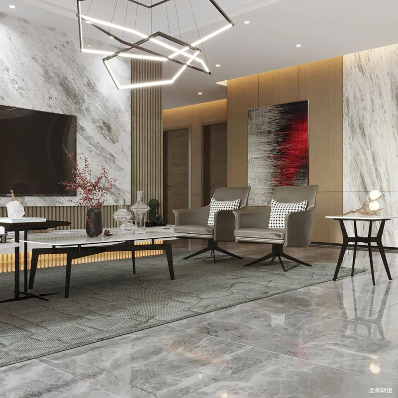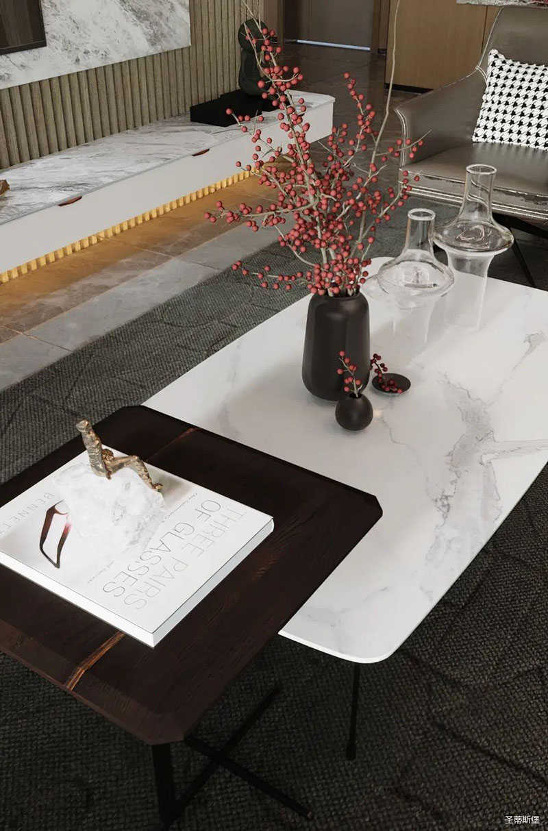 純美的線條,沉穩的色澤,為空間定下了低調而華麗的基調。渾然天成的實木與巖板紋理,讓角幾蕩漾出一幅“水光瀲滟”的潑墨油畫。三兩紅枝點綴,表達著“枝頭并蒂祝吉祥”的美好祝愿。光影透過極簡金屬幾腳,折射出一種隱藏的優雅氣質。大小、高低不一的天然材質角幾組合在一起,時尚又個性,不僅便于移動,還表現的靈活且輕巧。