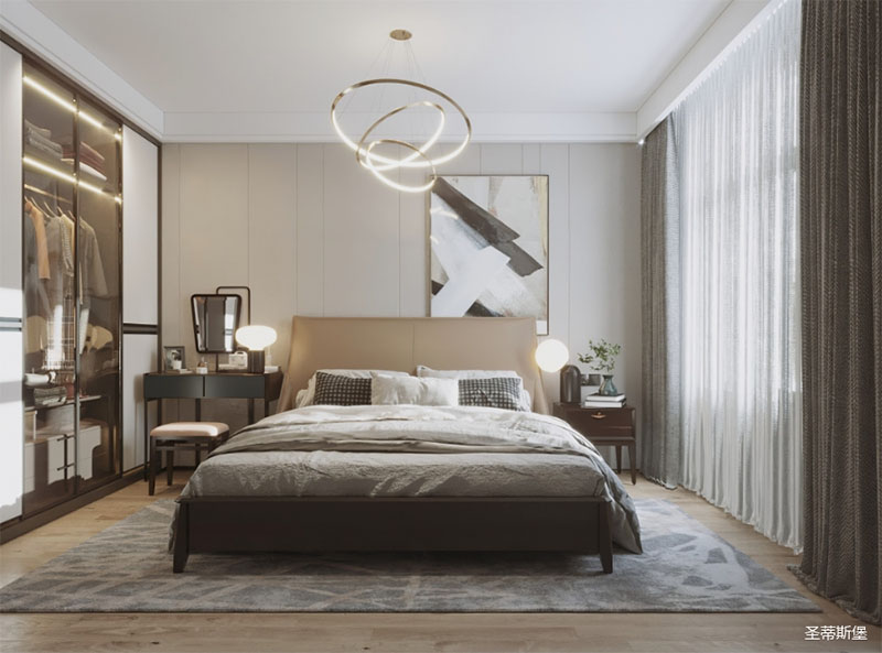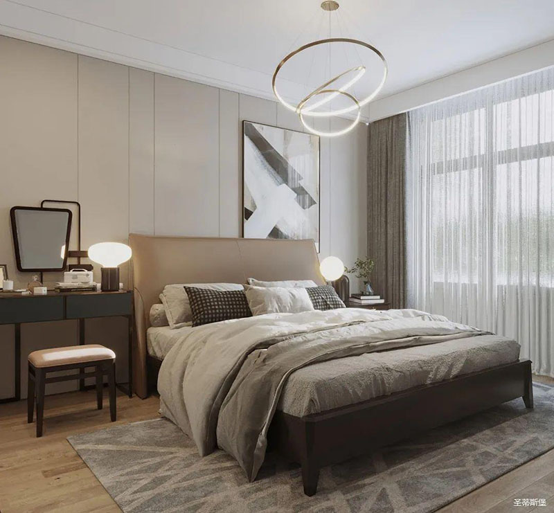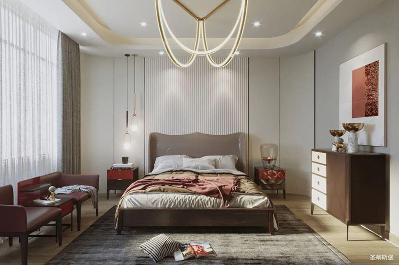 靈活變裝的主臥空間,自成獨特的設計語言與真摯的感情糅合。經典意式極簡軟床,流暢順滑的真皮床屏,賦予了空間溫馨高貴的氣息。酒紅實木質感的床頭柜,整齊擺放,欲有“鴻運當頭”的美好寓意,塑造出一方簡約知性的靈動空間。