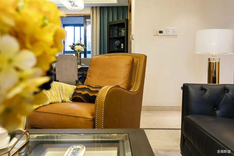 極具時尚設計格調的透明茶幾,不僅中和了沙發的厚重感,還令空間更為清透明亮!