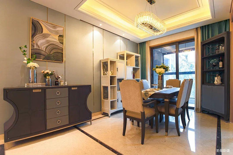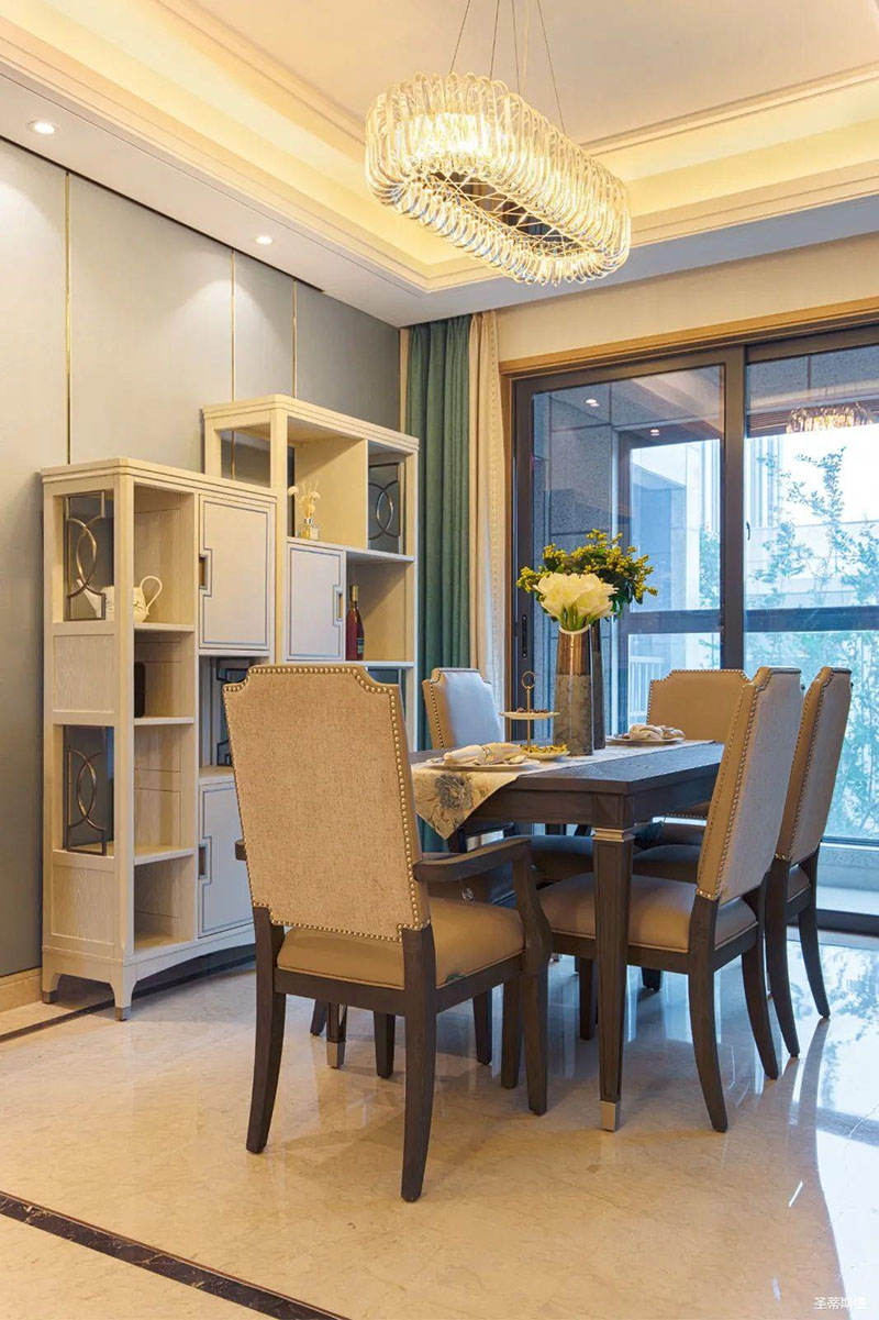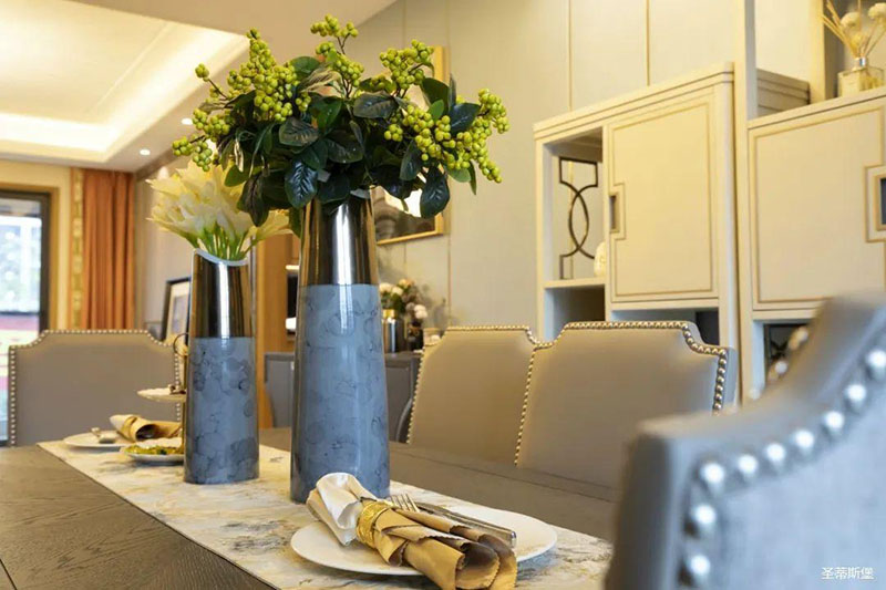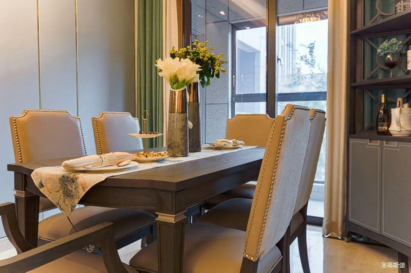 看似傳統實木的餐桌,細節之處卻盡顯輕奢精致格調,高級灰軟包,原金屬鉚釘嵌入,在體現時尚感的同時,也提升了用餐的舒適度。