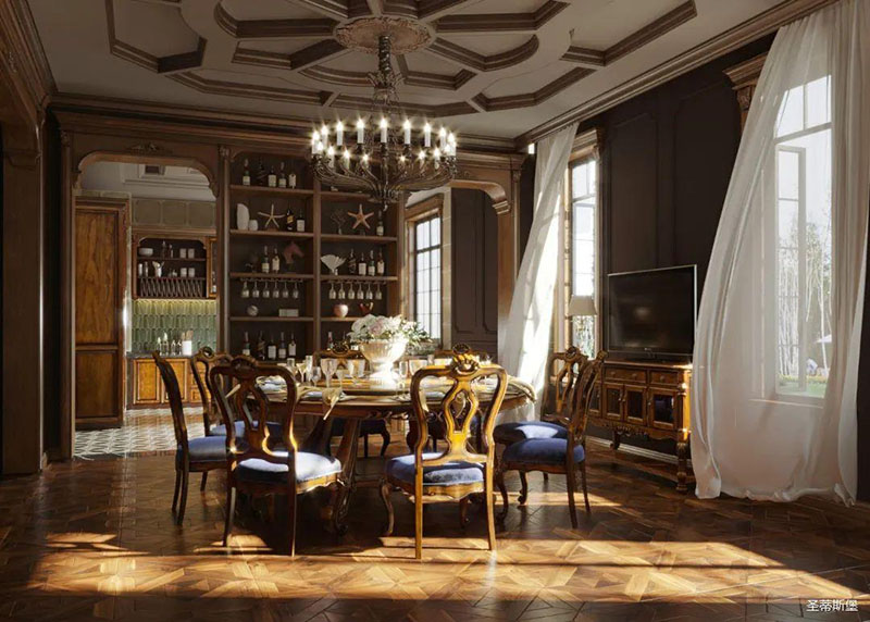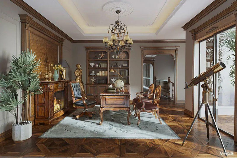 書房護墻板是由白楓木皮拼接的花鬘圖案,顏色層次分明,立體感超強,營造了滿滿的美式鑲嵌藝術感。深沉木色邊柜在護墻板上延伸,逐漸浸染了古銅色的家具和燈飾,結合著拱形羅馬柱,塑造出端雅大方的環境氛圍。