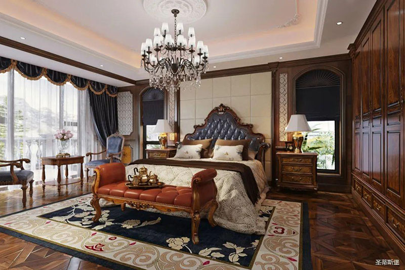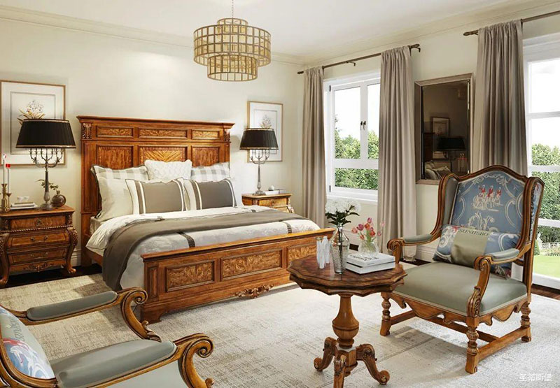 次臥最為耀眼的就是愛情堡壘高屏床~外形擁有著美式堡壘的優雅大氣,床屏猶如一座大山佇立在床頭,寓意著“生活有靠山”。粗獷的線條輪廓與細膩的艷陽花拼接工藝,展現著生活中的浪漫與自由不羈。