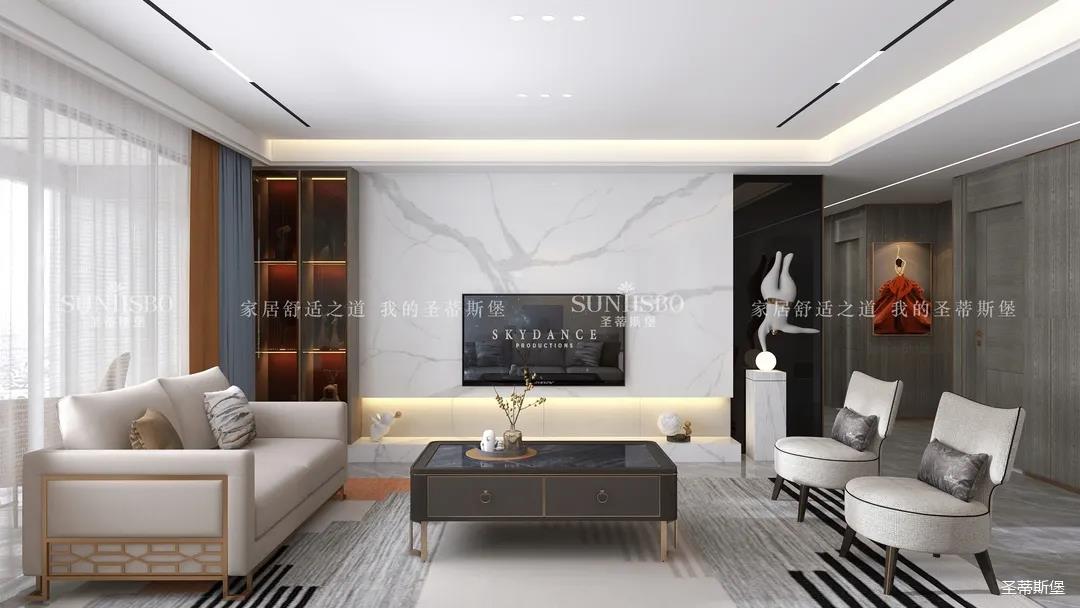 相比于北歐風格,現代簡約設計的整體空間感更為舒適,大理石裝飾的時尚簡約氣質與沉穩的實木色澤相得益彰,滿足了當代年輕人從簡的生活態度也不失實用性。
