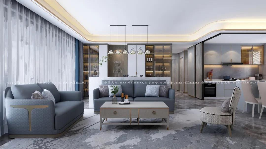 “七分藏三分漏”的設計理念是簡奢風格中應用最多的,運用隱藏式玻璃移門或拉門,可避免做全開方式收納導致的積灰、難清理等問題。玻璃材質本身的特質就是時尚的代表,而且具有極好的抗氧化性和防潮等功能,天然環保。其通透明亮的質感,且無繁復裝飾,直接連接了空間整體性,賦予了空間自由舒適的寧靜感。