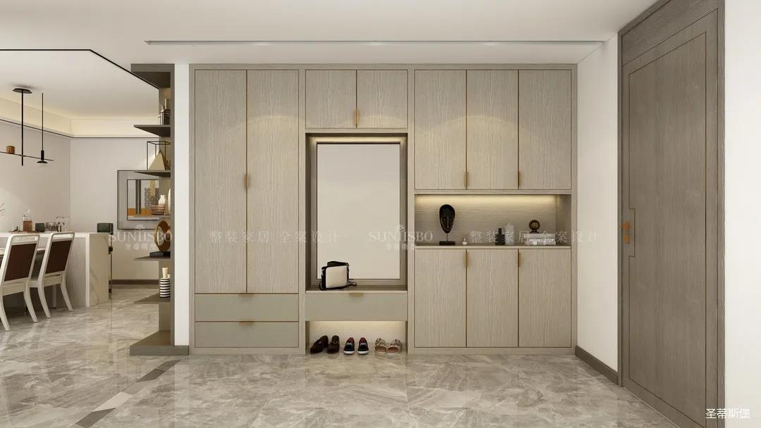 玄關柜采用內嵌式設計,柜體合理分區,可涵蓋大量入戶閑置物品。