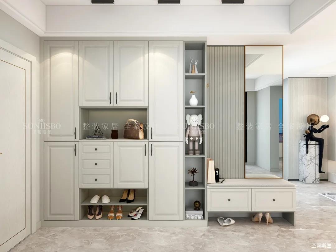 入戶側面設計一字型玄關,腰部,底部留空做層板,便于隨手放置鑰匙、鞋包等物品,中間留空設計為開放展示區(qū),加上軟裝飾品點綴,達到業(yè)主對品質生活追求的理想狀態(tài)。應女主人要求,玄關還加長延伸出妝鏡和換鞋凳,讓動線自然流暢。