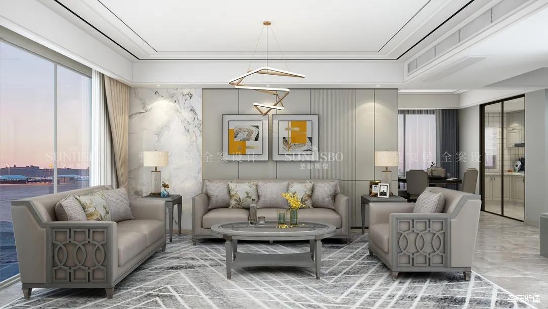 客廳在太陽的余暉下襯得柔和樸素,通透自然。超大江景落地窗,引入充足的自然光線灑向屋內,整體空間去除繁復的設計,以柔和的線條作為鋪設,沙發(fā)側面與地毯中的幾何造型組建了一個極富藝術感的空間,采用天然實木材質制作的家具和織物,色彩淡雅且不張揚。隨處可見的藝術造型裝飾,無一不展示著美式格調中輕奢的韻味。