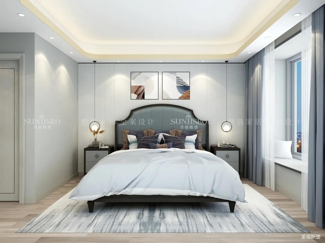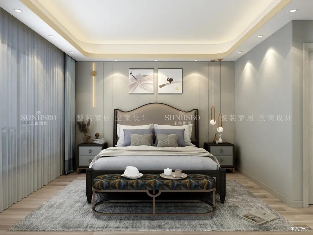 主臥整體暖色色系為空間注入了專屬調性,高明度的家具色彩與整體空間區(qū)分,透過材質肌理與光線相互交疊,傳達著空間里安定溫暖的情緒。立體輕奢的床尾凳,提示著空間主人對時尚的高質量生活追求。