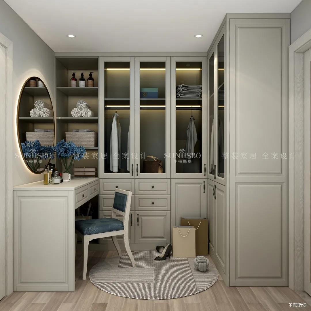 利用主臥多出來的小空間,設計打造出步入式衣帽間。定制了L型的轉角衣柜,提供了超強的收納空間。圓形的裝飾地毯與妝鏡相呼應,彰顯著空間女主人對精致生活的態(tài)度。