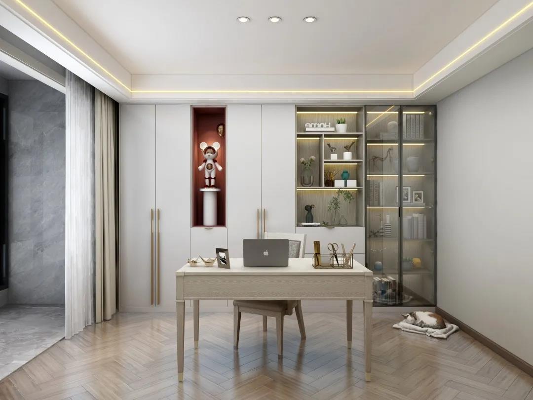 書柜以虛實(shí)結(jié)合的體塊感呈現(xiàn),疏密不一,相異的色調(diào)在橫縱間碰撞交錯(cuò),演繹靈動(dòng)隨性之美,踱入書房,這一隅是閱讀、辦公最好的場(chǎng)所。